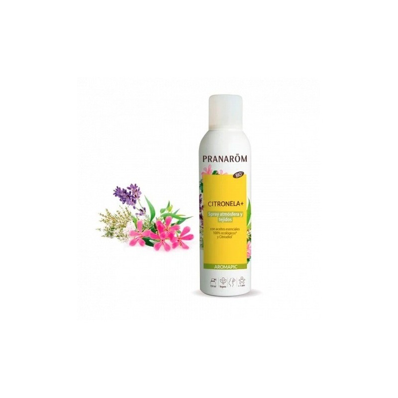Pranarôm Citronela+ es un spray ambiental y para tejidos formulado con aceites esenciales 100% ecológicos. Este producto es ideal para repeler insectos y refrescar el ambiente, proporcionando una fragancia natural y agradable. Es apto para uso en interiores y exteriores.