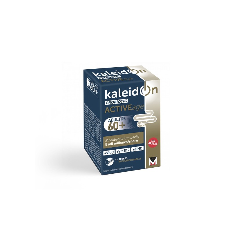 Kaleidon ACTIVEage es un complemento alimenticio que contiene el probiótico Bifidobacterium Lactis HN019, vitamina C que contribuye a la función normal del sistema inmunitario, vitamina B12 que contribuye a la reducción del cansancio y la fatiga y zinc que contribuye a la protección de las células del estrés oxidativo.