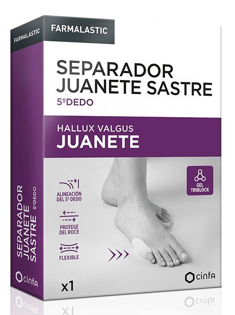 El Separador de Juanete de Sastre (5º dedo), para adultos, está indicado para personas que tienen juanete de sastre. Ayuda a alinear el quinto dedo del pie evitando una superposición sobres los dedos contiguos. Ayuda a aliviar el dolor provocado por el roce del calzado (fricción excesiva) El Separador de Juanete de Sastre (5º dedo) de Gel Triblock está diseñado ergonómicamente para adaptarse al quinto dedo del pie con facilidad. El gel es multidireccional, suave y flexible, eliminando la fricción con el calzado al caminar. Cuenta con memoria de recuperación, vuelve a su forma inicial tras su uso. El gel lateral protege el juanete de sastre del exceso de fricción. Se puede reutilizar. Apto para utilizar calcetines.